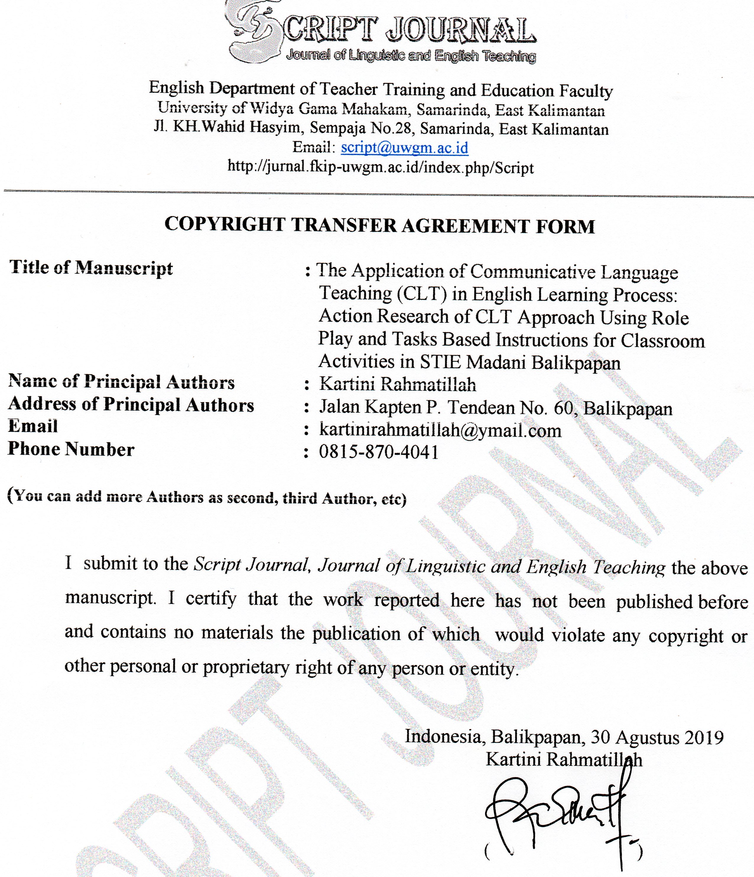 This research focuses on several aims, first whether Communicative Language Teaching (CLT) through Role Play and Task Based Instruction best implemented in English learning process in STIE Madani Balikpapan.Second it aims to prove whether Communicative Language Teaching (CLT) can improve students’ English skill based on TOEFL score. Third, it aims to find out students’ perception about the implementation of Communicative Language Teaching (CLT) in English learning process in STIE Madani Balikpapan.It is a combination of quantitative and qualitative research in which survey, experiment, and interview are done related to the aims of the research. The sample is 37 students from two classes that took English Practice/TOEFL subject in academic year of 2019-2020. The result stated that Communicative Language Teaching (CLT) is best implemented through role play and task based instruction.CLT helps students to better achieve their TOEFL score since there is an increase between the pretest and the post-test. Through the use of Communicative Language Teaching (CLT) approach in class, students feel they have interest more in learning English, do not feel afraid in making mistake again because they know they are still learning, and it helps them better in communication. Communicative Language Teaching (CLT) is a better promising way of learning English since in which students are practicing English as if they are using it in real situation.Further suggestion is that to make use of this approach in classroom activities and encourages students to actively participate in each activities, whether in classroom or outside the classroom.Â